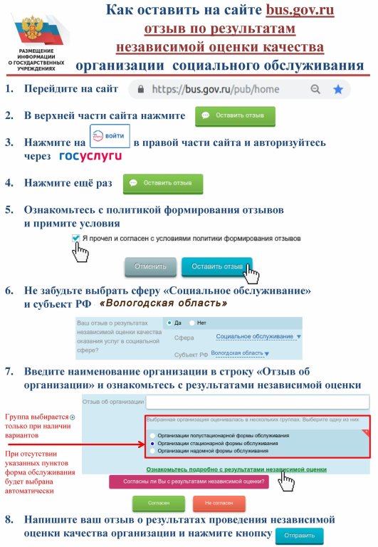 БУ СО ВО "Шекснинский центр помощи детям, оставшимся без попечения родителей, "Альтаир" информирует о работе сайта bus.gov.ru БУ СО ВО «Шекснинский центр помощи детям, оставшимся без попечения родителей, "Альтаир» информирует о работе сайта bus.gov.ru На официальном сайте для размещения информации о государственных (муниципальных) учреждениях www.bus.gov.ru размещаются сведения о качестве деятельности организаций, расположенных на территории Вологодской области, предоставляющих социальные услуги. Сайт www.bus.gov.ru реализует возможность оставить свой отзыв гражданами о качестве услуг, предоставляемых организациями социального обслуживания, с приглашением заинтересованных лиц воспользоваться предоставляемым ресурсом и принять участие в оценке деятельности организаций.